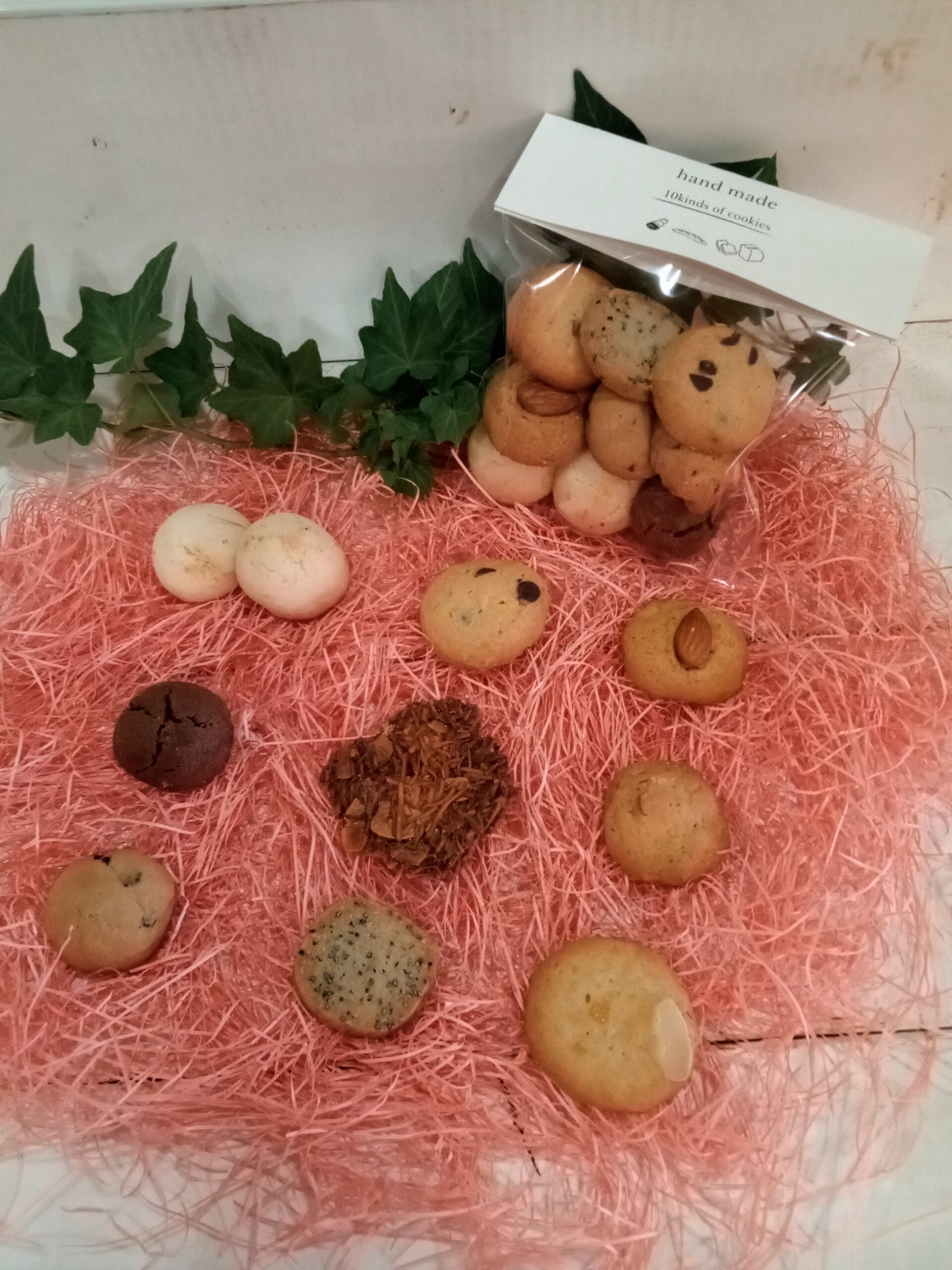 内容:ほろほろ3種、アーモンドクッキー、レーズンクッキー、ナッツクッキー、レモンクッキー、ごまクッキー、チョコクッキー、木の葉クッキー